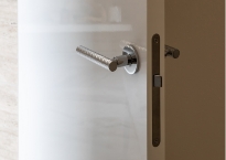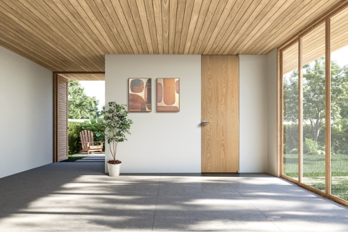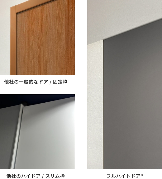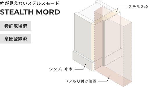 特許技術の完全枠レス納まりでスッキリ壁面化®。面の美しさを追求しました。枠のある室ネイドアでは表現することができなかったフルハイトドア®独自の納まりは、意匠性や施工性の異なる2種類の枠から選択できるようになっています。