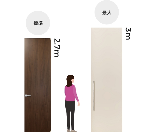 木製ドアは非常に反りやすく、しかも背が高くなるほど顕著です。長年にわたり独自の研究を重ね、高品質の実現に挑戦してきたKAMIYAフルハイトドア®は高さ2.7mが標準。さらに日本では最大クラスの3mまで商品化しています。