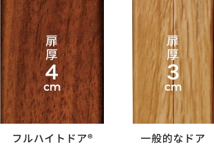 日本の室内ドアの厚みは一般的に3.0〜3.6cmですが、海外では4cmあります。開発当初から反りと向き合い3.6cmの厚みを採用していましたが、さらなる品質向上を目指して2019年9月に4cmに改定。世界基準の厚さを採用し、品質とともに存在感とグレード感を高めています。