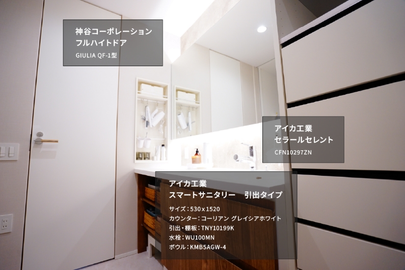 北陸で唯一、アイカの洗面空間を実際に見て触れられるショールームであり、フルハイトドアをはじめ、アイカ工業の洗面台や南海プライウッド、森田アルミ工業、ABC商会の商品などをリアルな暮らしの中でご体感いただけます。